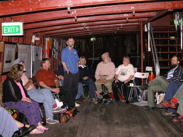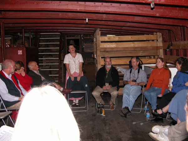 Margaret Walters leads a song from the forebitts